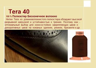 Нитки Tera из длинноволокнистого полиэстера обладают высокой разрывной нагрузкой и устойчивостью к трению. Поэтому они - оптимальный выбор для износостойких закрепляющих швов и декоративных швов на кожаных изделиях, ремнях, брезенте и др.